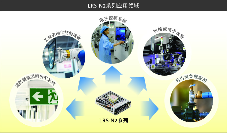LRS-N2 系列除符合 UL/EN 62386-1 信息类认证,亦符合工业电源类 EN 61558-1 OVC III 设计。整体来说,具 OVC III 设计的产品较适合工业设备使用,可直接从配电箱接线并节省需额外透过一级隔离变压器的使用成本。此系列符合信息类及工业电源双认证可协助客户缩短认证申请,可搭配各种电子设备或机械设备使用,如机械手臂、马达类负载、咖啡机、消防紧急照明供电系统等。若您有设备需求具备 200% 瞬间峰值功率的应用方式,可选用 LRS-N2 系列产品或请与明纬业务团队做联系。