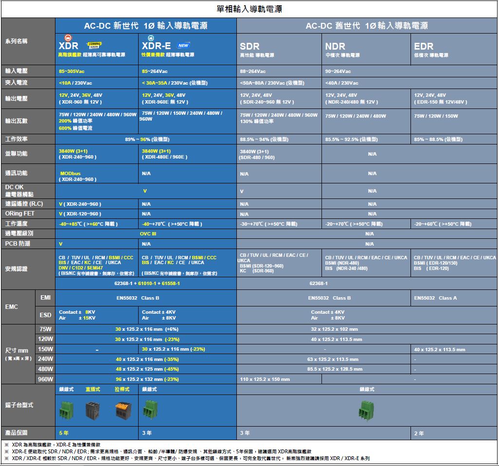 XDR-E 系列:75W~960W 全新世代 1Ø 输入超薄性价兼备导轨电源