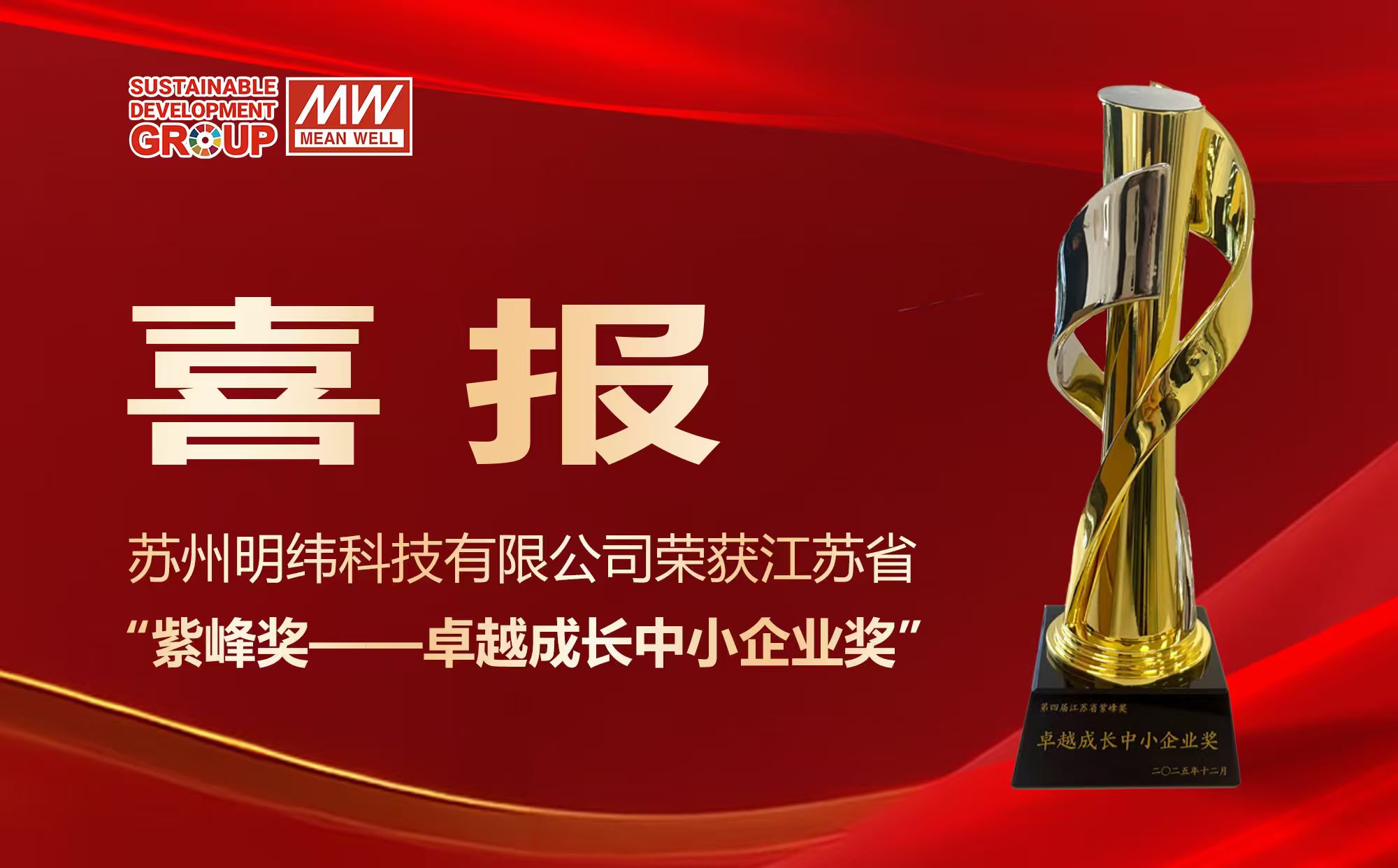 明纬集团(MEAN WELL)很荣幸宣布,苏州明纬科技有限公司于 12 月 16 日举行的第四届江苏省紫峰奖发布仪式中,凭借卓越的创新实力,荣获「卓越成长中小企业奖」肯定,充分展现明纬长期深耕市场、持续精进的经营成果。