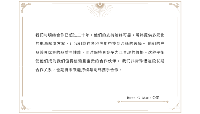 结合双方在各自领域的专业优势,BUNN 与 MEAN WELL 共同打造高品质且值得信赖的饮品设备解决方案,持续为全球市场提供稳定且高效的使用体验。