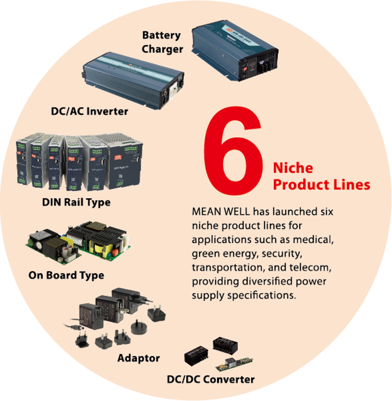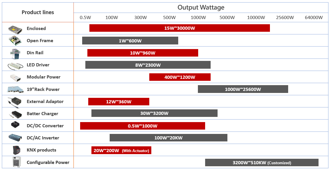 Fidèle à l'esprit d'innovation continue de l'entreprise, MEAN WELL ajoute chaque année 10 % de nouveaux appareils à ses gammes de produits. Nous proposons désormais des solutions d'alimentation complètes dans une plage de 0,5 W à 25 600 W à différentes qualités pour répondre aux exigences d'application des industries individuelles, notamment : alimentation AC/DC, pilotes LED, chargeurs de batterie AC/DC, convertisseurs DC/DC et DC/AC. onduleurs.