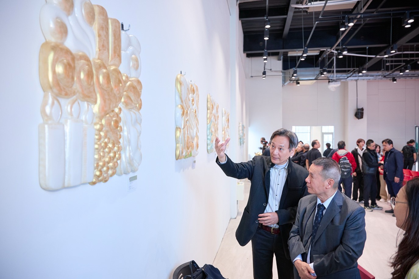 ▲Bronze sculpture artist Kuang- Wei Luo (left) introducing the Genesis Series to SDG Group Founder Jerry Lin (right).