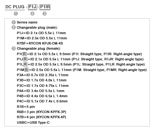 - DC PLUG-P1J-P1M / DC PLUG-P1J-P1I / DC PLUG-P1J-P1L / DC PLUG-P1J-P3A / DC PLUG-P1J-P3B / DC PLUG-P1J-P3C / DC PLUG-P1J-P4A / DC PLUG-P1J-P4B / DC PLUG-P1J-P4C / DC PLUG-P1J-P1IR / DC PLUG-P1J-P1MR / DC PLUG-P1J-P1LR / DC PLUG-P1J-P1JR / DC PLUG-P1J-R1B / DC PLUG-P1J-R6B / DC PLUG-P1J-R7B / DC PLUG-P1J-USBC