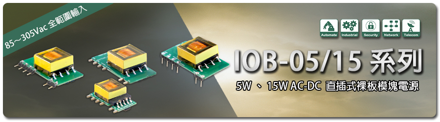 IOB-05/15 系列是一款體積小巧、性能穩定的AC-DC 裸板型模組電源,產品主要特點:小型化設計、85~305Vac 全範圍輸入,可相容全球電網、超低待機功耗 <0.15W,節能環保、-40~+85℃超寬工作溫度範圍、完整多重保護功能,可確保設備安全運行、特別適合安裝於空間受限的儀器設備內的PCB基板上,如:工業自動化、電力儀錶、智慧家居…等應用。